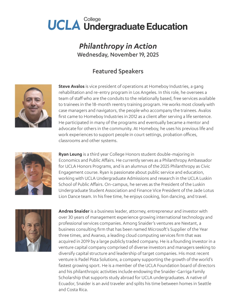 The Philanthropy in Action Speaker series is an evening of conversation and inspiration, where leaders from business, philanthropy, and the nonprofit sector share how generosity and purpose have shaped their lives. Students will hear stories of resilience and impact—and discover ways to create their own paths toward meaningful change.